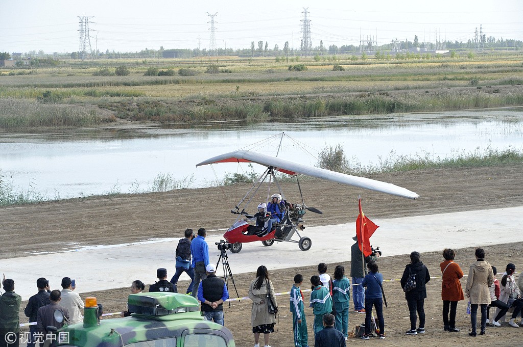 2018年9月27日,在银川市贺兰县宁夏安翔航空运动俱乐部航空飞行基地,航空运动爱好者正在进行航空飞行。当天,宁夏第三届全民健身节暨2018第二届宁夏贺兰航空体育科普节在贺兰县举行。在航空体育科普节上,来自全国各地的航空运动爱好者现场进行动力三角翼飞行表演和动力伞飞行表演。其中进行动力三角翼飞行表演的飞行员中最为有名的当属被媒体和航空界誉为“中国农民第一飞”的刘亦兵。