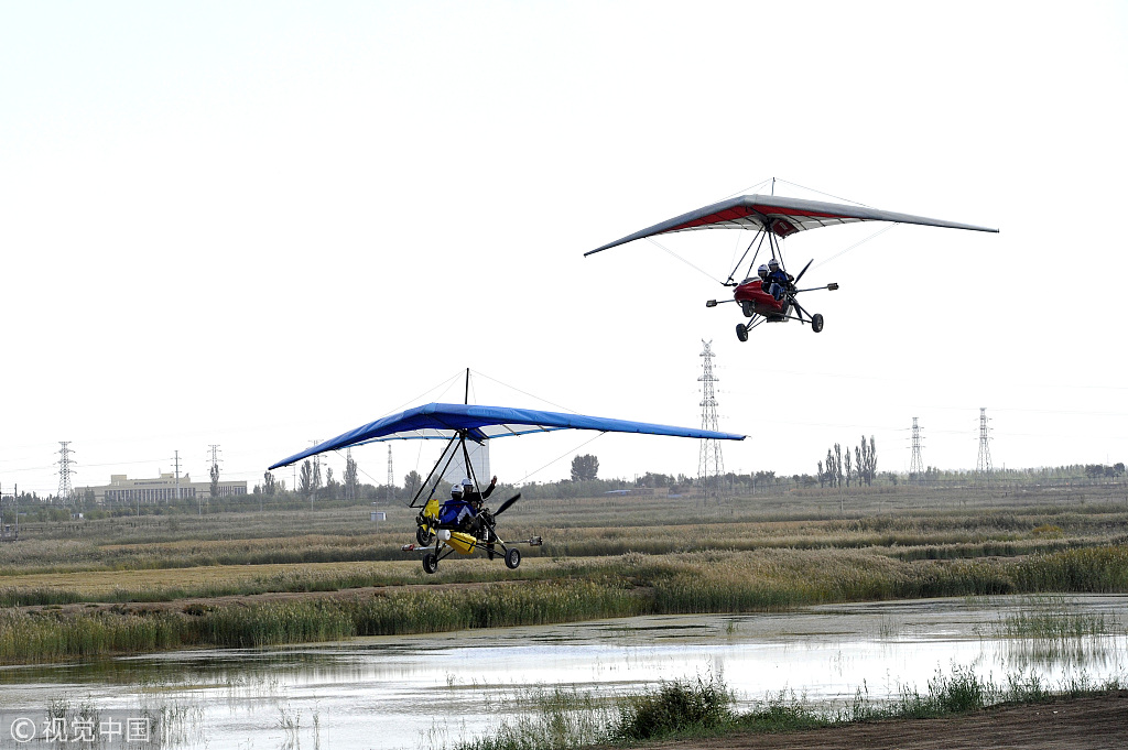 2018年9月27日,在银川市贺兰县宁夏安翔航空运动俱乐部航空飞行基地,航空运动爱好者正在进行航空飞行。当天,宁夏第三届全民健身节暨2018第二届宁夏贺兰航空体育科普节在贺兰县举行。在航空体育科普节上,来自全国各地的航空运动爱好者现场进行动力三角翼飞行表演和动力伞飞行表演。其中进行动力三角翼飞行表演的飞行员中最为有名的当属被媒体和航空界誉为“中国农民第一飞”的刘亦兵。