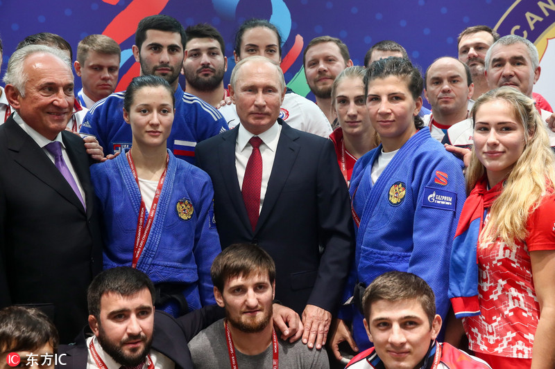 当地时间2018年9月27日,阿塞拜疆巴库,俄罗斯总统普京访问阿塞拜疆,观看第32届世界柔道锦标赛,并与俄罗斯国家柔道队队员合影。