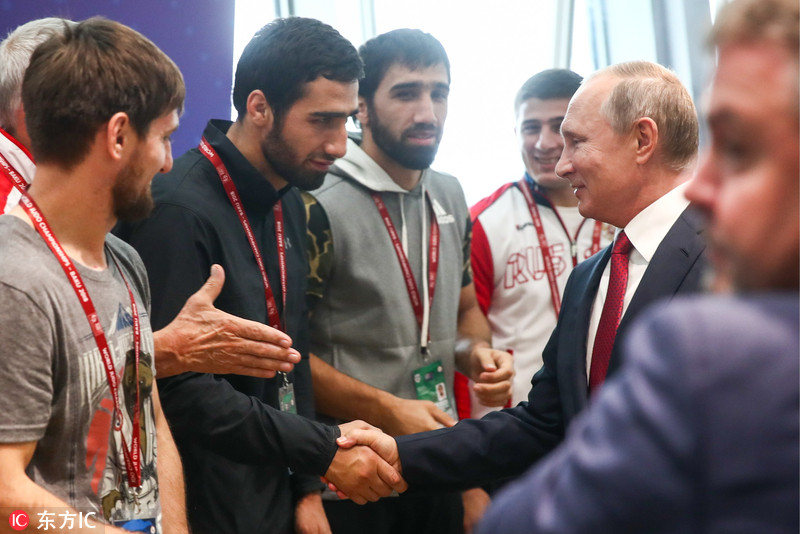 当地时间2018年9月27日,阿塞拜疆巴库,俄罗斯总统普京访问阿塞拜疆,观看第32届世界柔道锦标赛,并与俄罗斯国家柔道队队员合影。