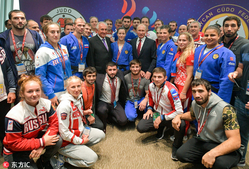 当地时间2018年9月27日,阿塞拜疆巴库,俄罗斯总统普京访问阿塞拜疆,观看第32届世界柔道锦标赛,并与俄罗斯国家柔道队队员合影。