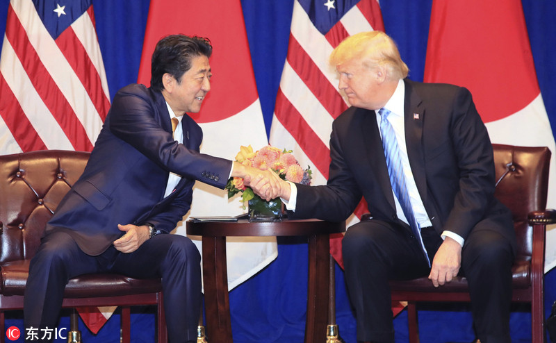 ​当地时间2018年9月26日,美国纽约,第73届联合国大会举行期间,美国总统特朗普与日本首相安倍晋三举行双边会谈。会谈期间,特朗普向安倍和媒体展示朝鲜最高领导人金正恩的信件。