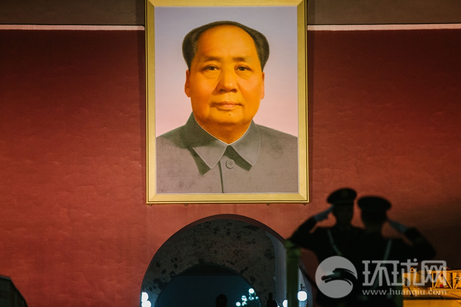 2018年9月27日晚11时,在小雨中,随着装载新画像的货车和吊车从天安门城楼驶出,一年一度的迎国庆天安门城楼更换新毛主席像工程开工。吊车把旧画像调离城楼,工作人员开始清理城楼画像悬挂处,随后挂上全新画像,整个安装过程约一小时。(摄影:李昊)