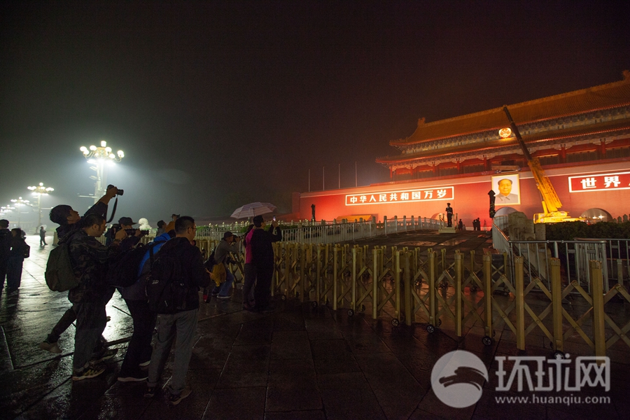 2018年9月27日晚11时,在小雨中,随着装载新画像的货车和吊车从天安门城楼驶出,一年一度的迎国庆天安门城楼更换新毛主席像工程开工。吊车把旧画像调离城楼,工作人员开始清理城楼画像悬挂处,随后挂上全新画像,整个安装过程约一小时。(摄影:李昊)