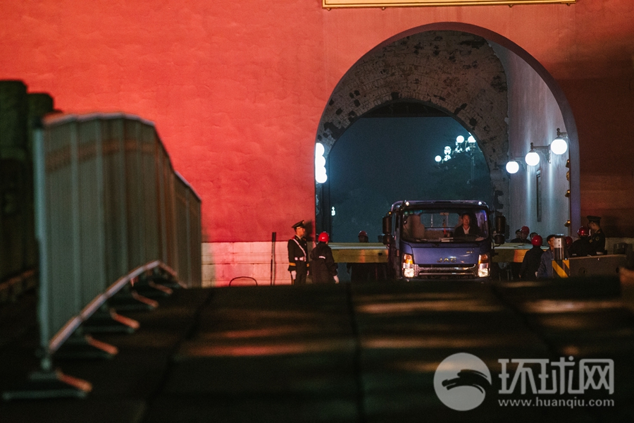 2018年9月27日晚11时,在小雨中,随着装载新画像的货车和吊车从天安门城楼驶出,一年一度的迎国庆天安门城楼更换新毛主席像工程开工。吊车把旧画像调离城楼,工作人员开始清理城楼画像悬挂处,随后挂上全新画像,整个安装过程约一小时。(摄影:李昊)