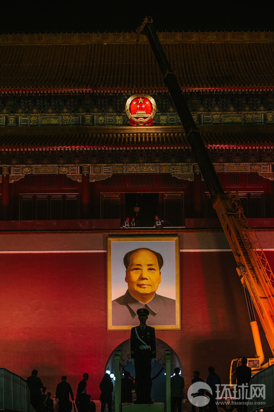 2018年9月27日晚11时,在小雨中,随着装载新画像的货车和吊车从天安门城楼驶出,一年一度的迎国庆天安门城楼更换新毛主席像工程开工。吊车把旧画像调离城楼,工作人员开始清理城楼画像悬挂处,随后挂上全新画像,整个安装过程约一小时。(摄影:李昊)