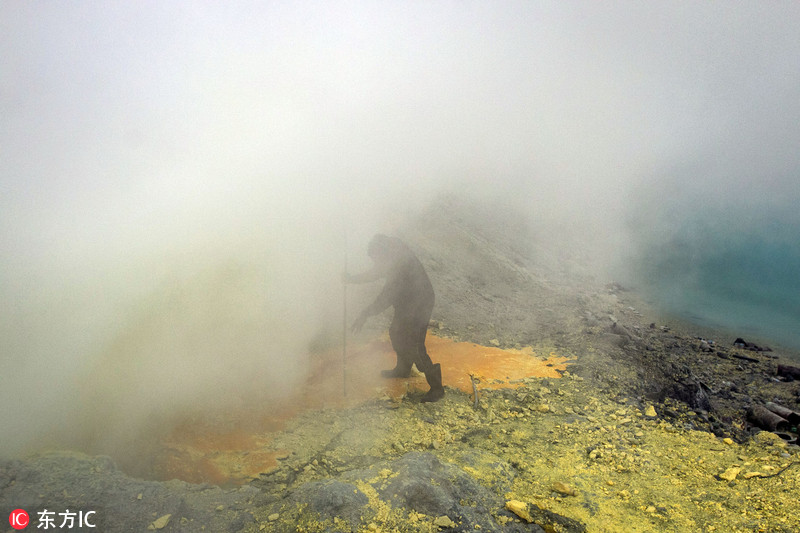 瓦伊真火山,一座位于东爪哇外南梦的活火山,山顶是天堂般静美的碧绿色火山口湖,谷底却是地狱般恶劣的硫磺采集地,这里不分昼夜浓烟滚滚,幽蓝色的火山不时喷发,山石和地面被黄色的硫磺粉末覆盖,未凝固的硫磺液体滚滚流淌,黄色的硫磺气体翻涌升腾,刺入鼻腔令人窒息。