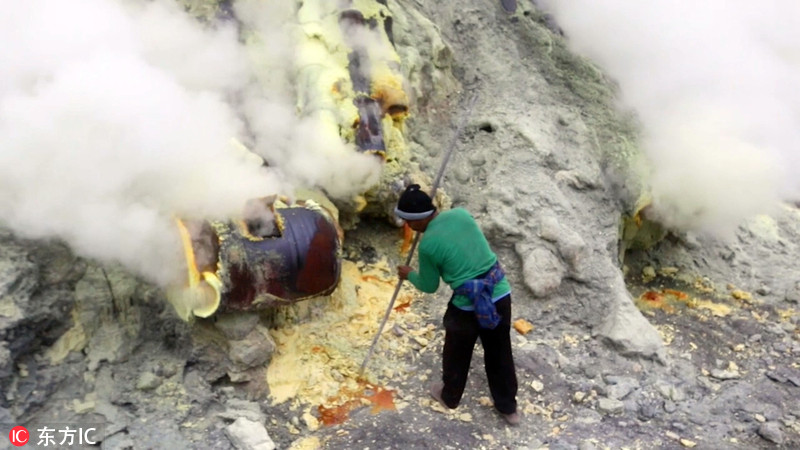 就是在这样如地狱般的环境中,硫磺工人们不得不冒着生命危险,为一家人的生计忙碌着,用铁杆将冷却的硫磺敲下来装框,从谷底挑到山顶,再从山顶送到山下。