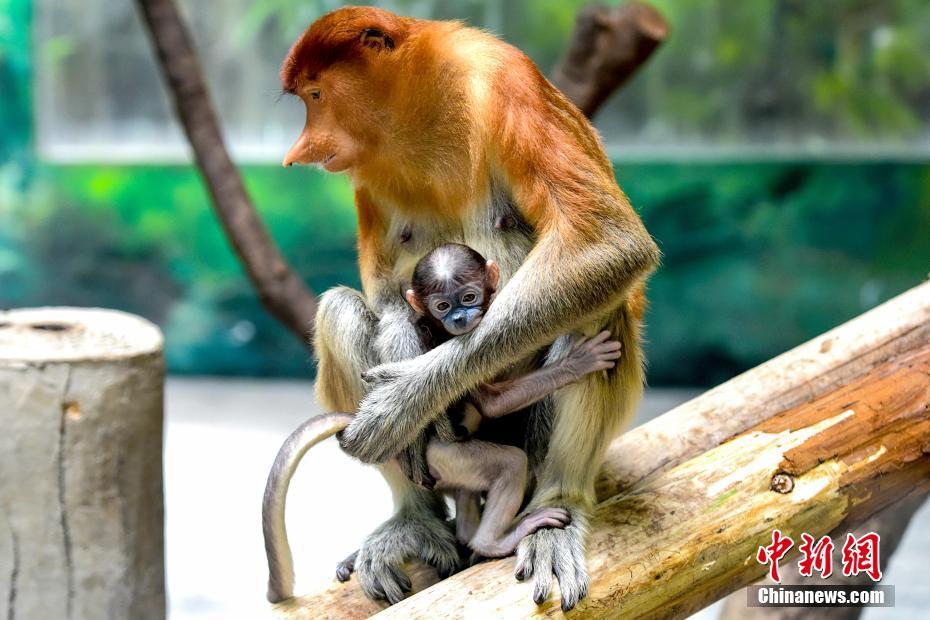 9月28日,大鼻猴妈妈抱着幼崽坐在树上休息。大鼻猴为东南亚加里曼丹岛的特有动物,名列《世界自然保护联盟》濒危物种红色名录濒危级别。2017年9月,广州长隆野生动物世界从印尼引进6只大鼻猴,为中国首次引进大鼻猴。2018年9月2日,8岁的大鼻猴Pety在广州长隆野生动物世界成功诞下中国第一只大鼻猴宝宝。国庆期间,这对珍贵大鼻猴母子将与广大游客见面。中新社发 小麦 摄