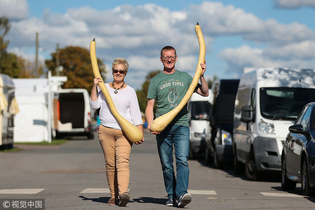 当地时间2018年9月28日,英国莫尔文,在莫尔文秋季展览会上,年度巨型蔬菜大赛举行,民众纷纷带着各类“巨无霸”蔬菜前往测量称重。西葫芦。