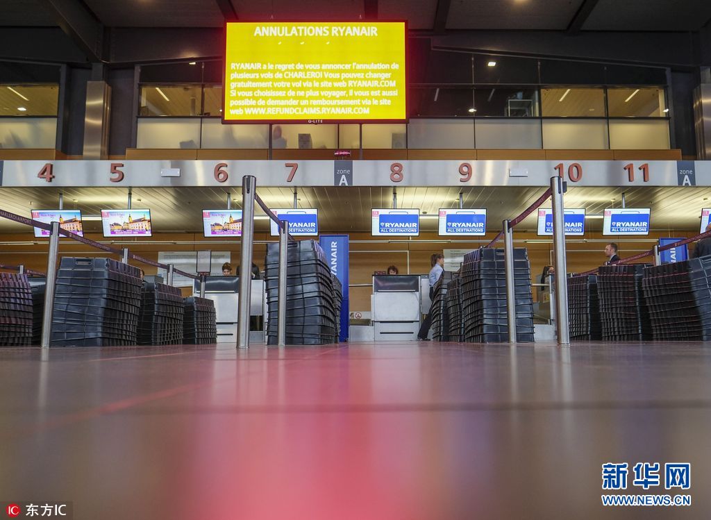 当地时间2018年9月28日,比利时沙勒罗瓦,因劳动合同和工作条件问题,欧洲最大廉价航空公司瑞安航空公司在比利时、德国、意大利、荷兰、葡萄牙和西班牙的员工举行罢工,造成当日约250个航班被取消,3万名乘客受到影响。(图片来源:东方IC)