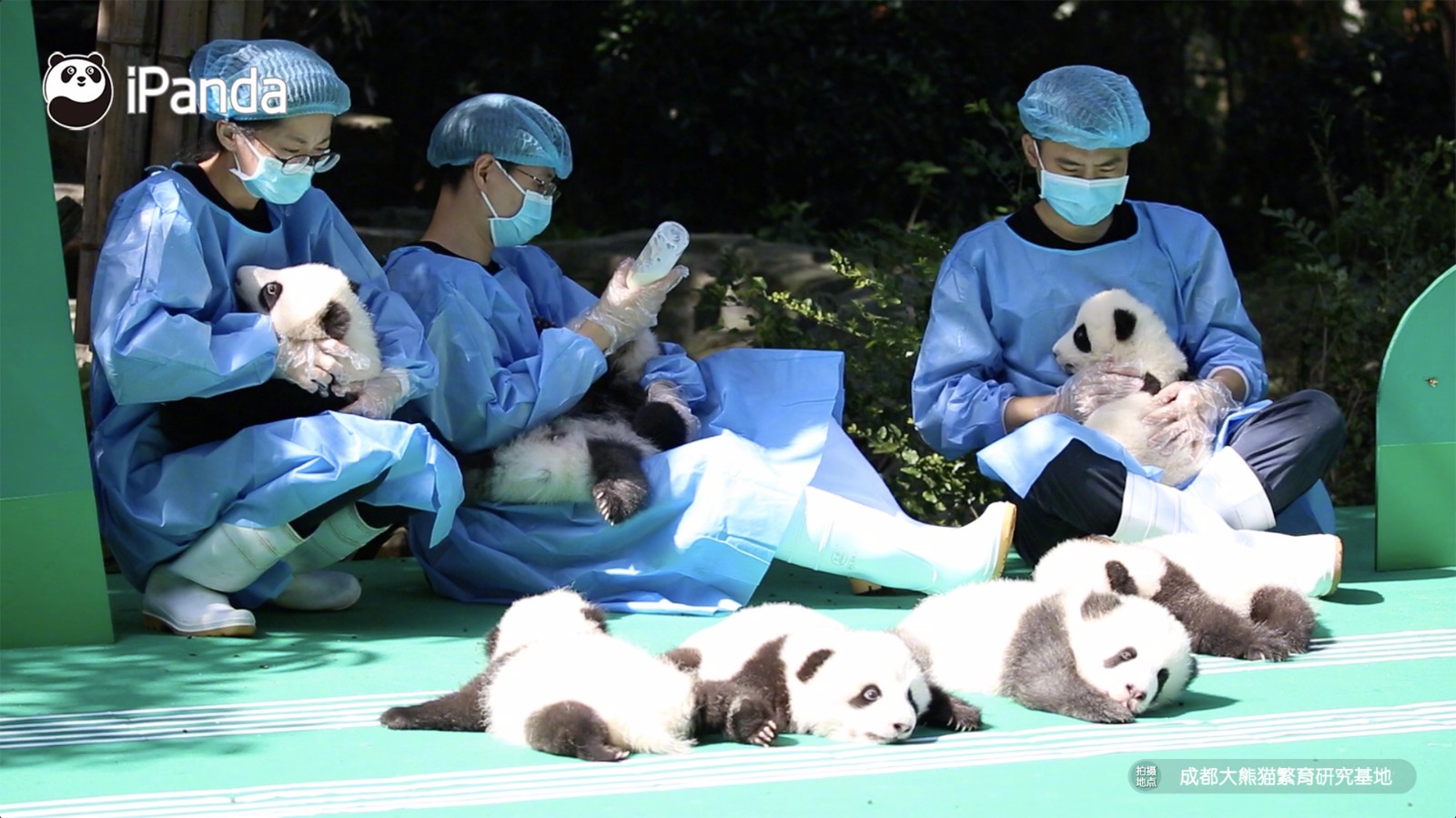 上午10点,在成都熊猫基地太阳产房活动场,由7只新生大熊猫宝宝组成的“太阳天团”依次被饲养员抱出场外。