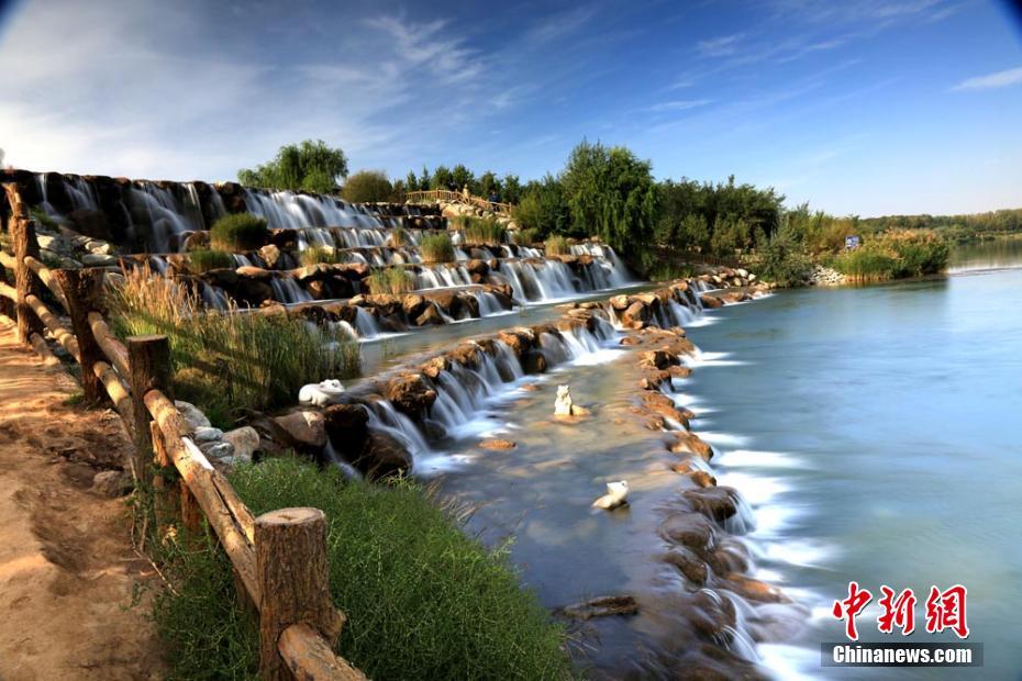 深秋时节,地处祁连山下的张掖滨河新区湖水清澈,白云悠悠,瀑布飞流,构成一幅美丽的秋景图。陈礼 摄