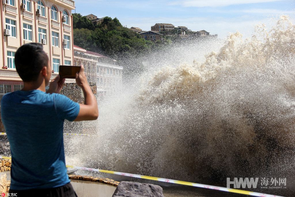 浙江温岭:十余米海浪惊涛拍岸 市民淡定围观