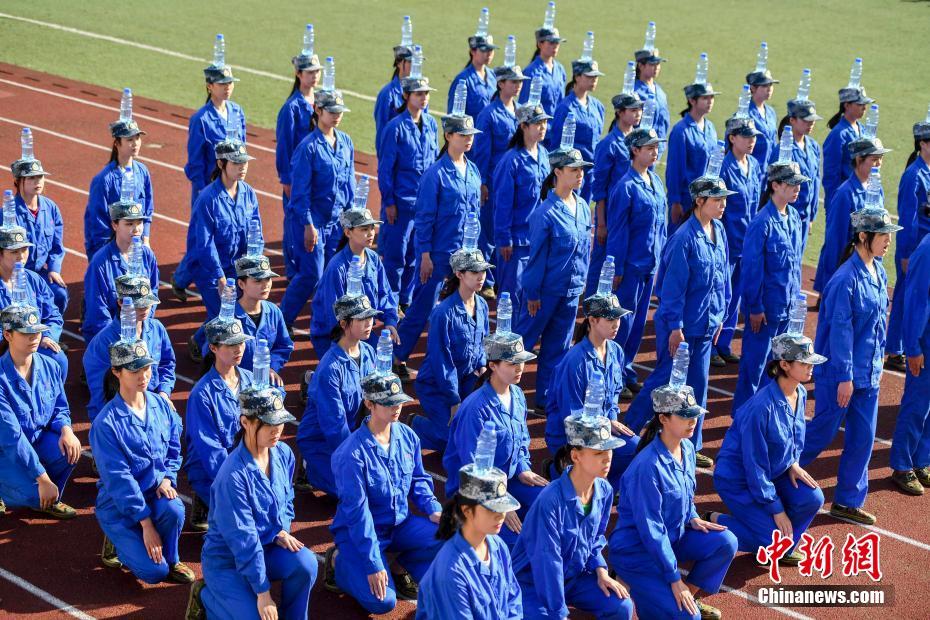 女生们头顶水瓶完成了转向、蹲下与起立、走正步等规范动作,稳健的步伐保证了头顶水瓶的稳定。杨华峰 摄