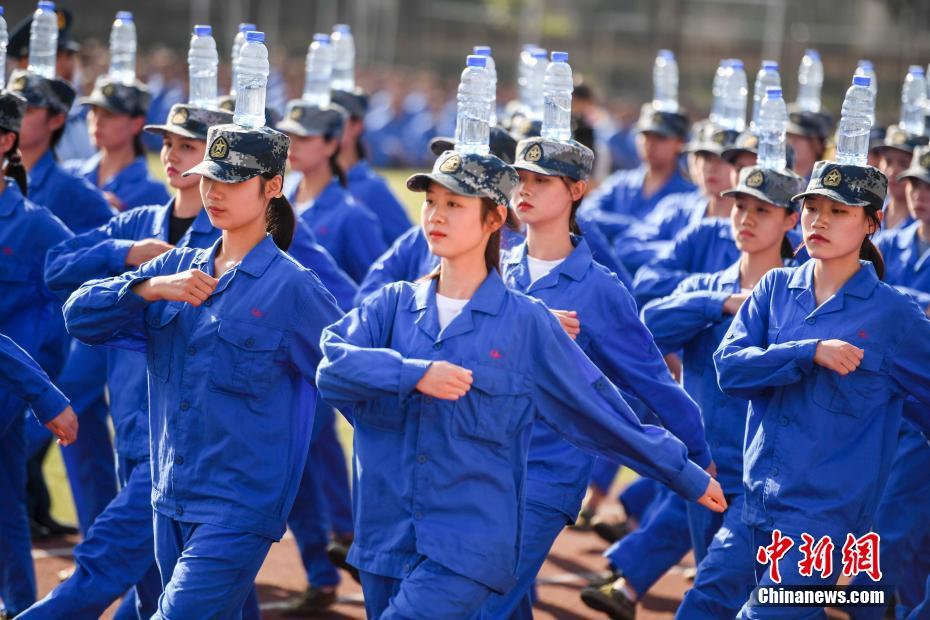 9月30日,长沙航空职业技术学院2018级军训总结表彰大会上,数十位女生组成的水瓶方队吸引眼球。 杨华峰 摄