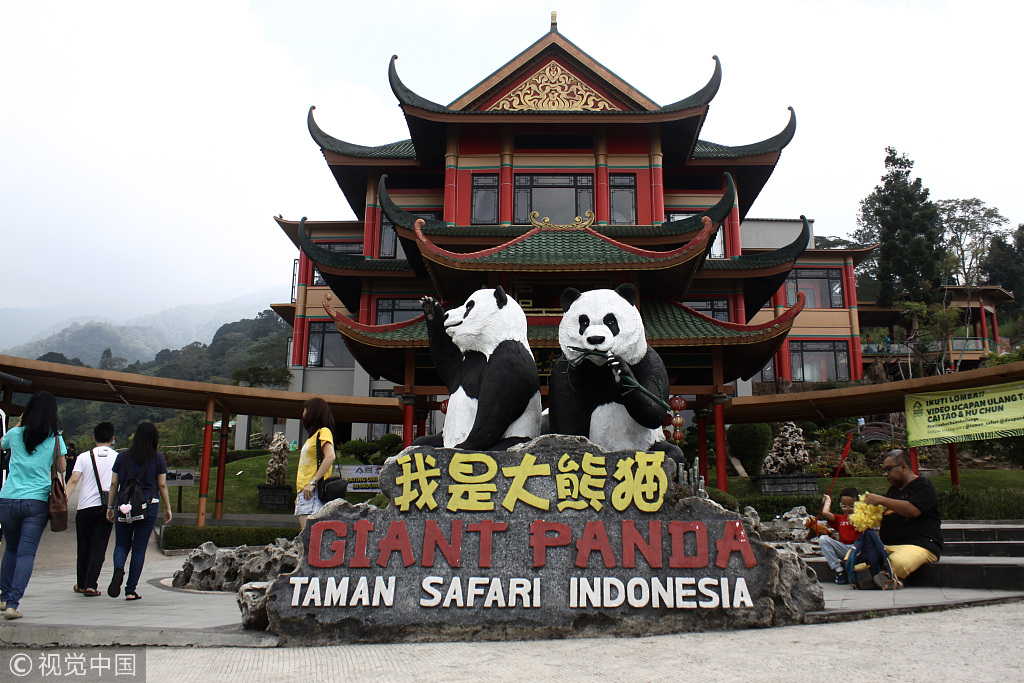 当地时间2018年9月28日,印度尼西亚Bogor,大熊猫“彩陶”和“湖春”落户印尼已满一年,动物园举行庆祝活动。2017年9月28日,来自中国的大熊猫“彩陶”和“湖春”落户印尼野生动物园。