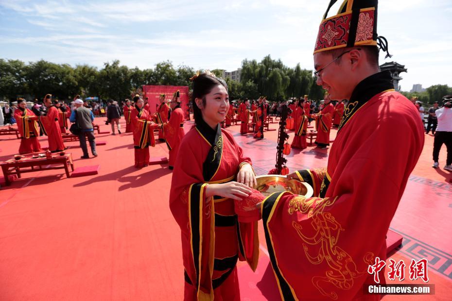 10月1日,来自全国各地的30对新人,身着汉服齐聚西安汉城湖畔,进行了一场集体汉式婚礼。新人们通过沃盥洁身、夫妻对拜、共牢而食、解缨结发、执手盟誓等环节,见证了爱情的海誓山盟。图为新人进行沃盥洁身。中新社记者 张远 摄