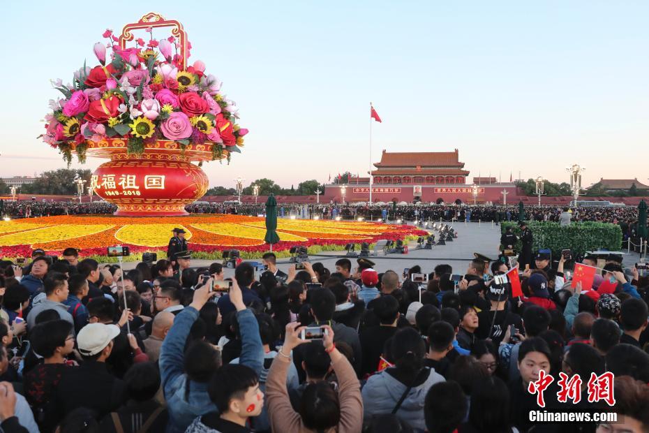 10月1日是中华人民共和国成立69周年纪念日。清晨,来自中国各地的近11万民众特意来到天安门广场观看升旗仪式并唱响国歌,为祖国母亲庆祝生日。中新社记者 盛佳鹏 摄