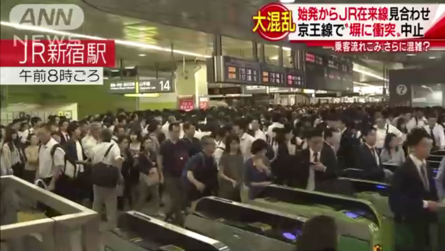 台风“潭美”袭击日本也给首都东京的交通带来严重影响,从1日早晨起列车运行时间严重混乱,所有班次晚点,大量上班族滞留车站,出行极其不便。