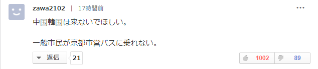 网友@zawa2102:希望中国人韩国人不要来。我们一般市民都坐不上京都市营公交了。