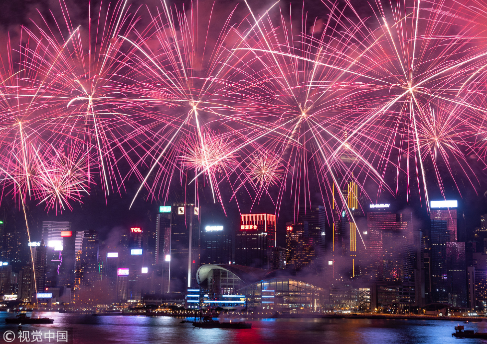 为庆祝中华人民共和国成立69周年和国家改革开放40周年,香港维多利亚港上空1日晚上演了一场精彩的烟花汇演。香港警方表示,大约有27万人观看烟花。