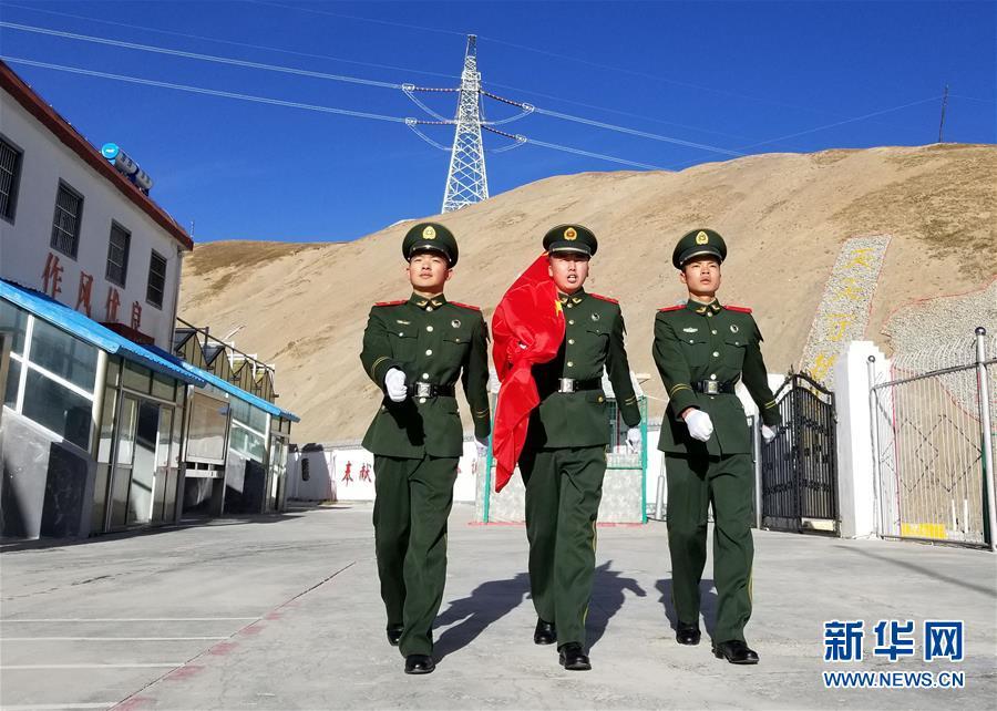 10月1日,在海拔4868米的哨所里,战士们举行升国旗仪式。 ​ 新华社发