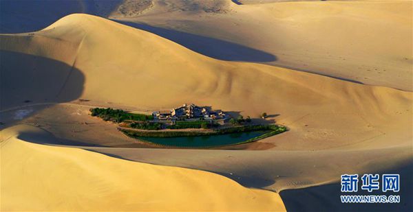 2016年9月9日拍摄的位于鸣沙山北麓的月牙泉。作为丝绸之路上的一颗璀璨明珠,敦煌历史悠久,是古代中国通往西域、中亚和欧洲的“咽喉之地”,拥有莫高窟和玉门关遗址等世界文化遗产。新华社记者陈斌 摄