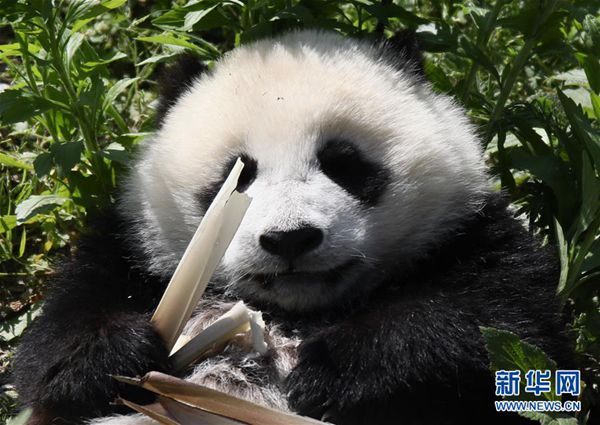 5月16日,熊猫宝宝在中国大熊猫保护研究中心神树坪基地里享受阳光和美食。新华社记者兰红光 摄