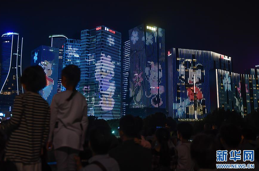 10月6日,人们在杭州钱江新城城市阳台观赏“我爱你中国”主题灯光秀。 国庆期间,杭州钱江新城城市阳台上演“我爱你中国”主题灯光秀,吸引大批市民和游客前来观赏。 新华社记者 黄宗治 摄