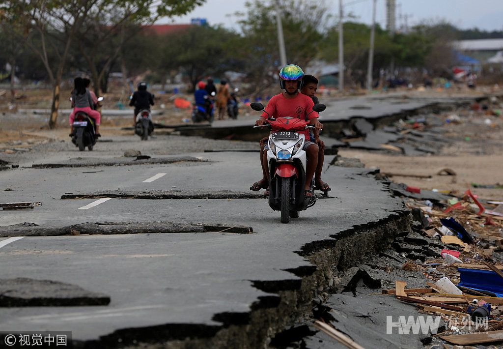 当地时间2018年10月7日,印度尼西亚帕卢,地震海啸灾区道路遭损毁。据6日消息,印尼中苏拉威西省首府帕卢和栋加拉县强震和海啸造成的死亡人数已上升至1649人。目前搜救工作仍在继续。