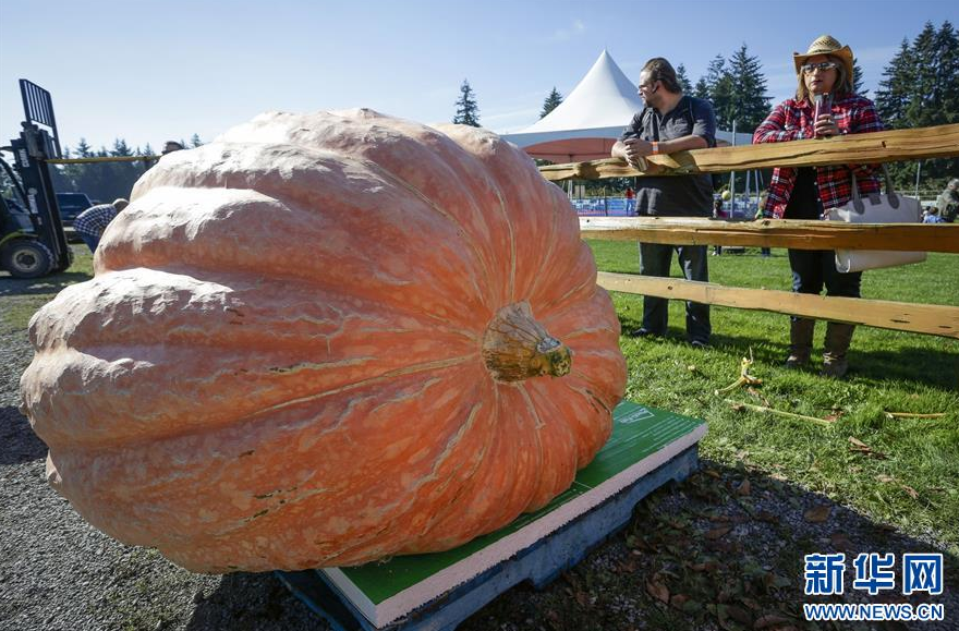10月6日,在加拿大不列颠哥伦比亚省兰利市,人们观看巨型南瓜。加拿大不列颠哥伦比亚省兰利市6日举行巨型南瓜大赛,吸引当地数十位巨型南瓜种植者参赛,争夺最重南瓜大奖。新华社发(梁森 摄)