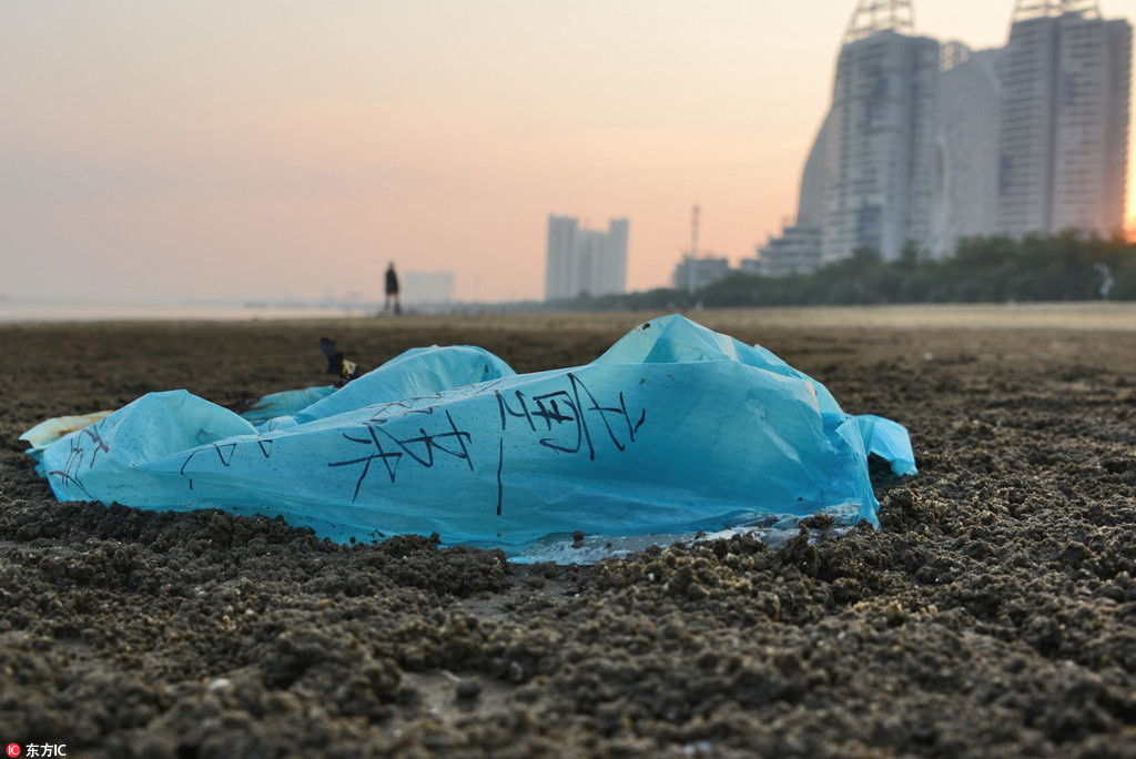 红橙黄绿蓝,海滩上留着各种颜色的垃圾。