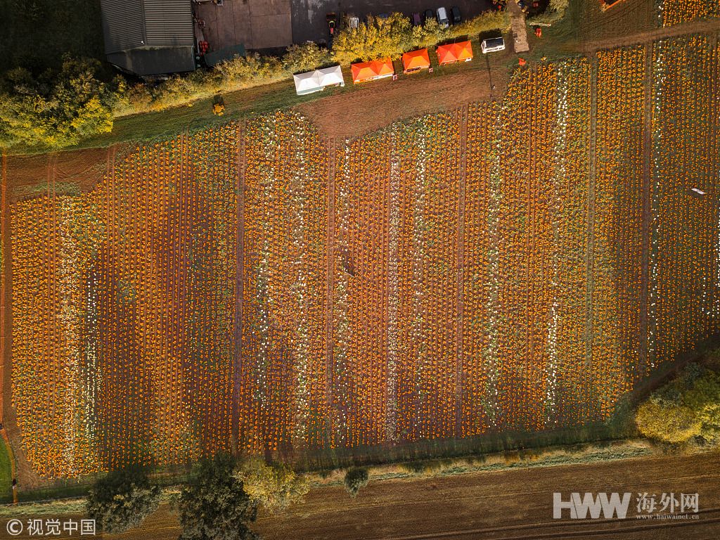 2018年10月8日讯(具体拍摄时间不详),英国诺丁汉,英国最大的南瓜田地之一,田里的南瓜已经成熟。目前,英国每年种植的南瓜超过1000万个,大多数南瓜将被消费者作为万圣节的装饰品而非食物购买。