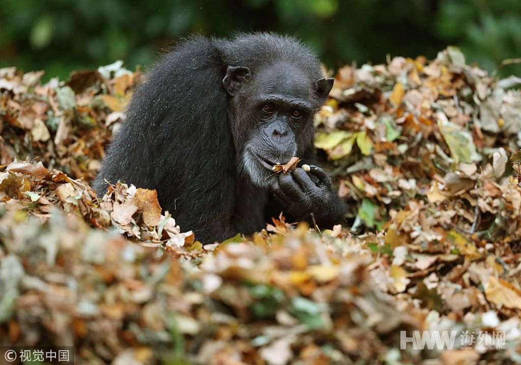 英国野生动物园秋意浓 黑猩猩落叶堆里翻找食物