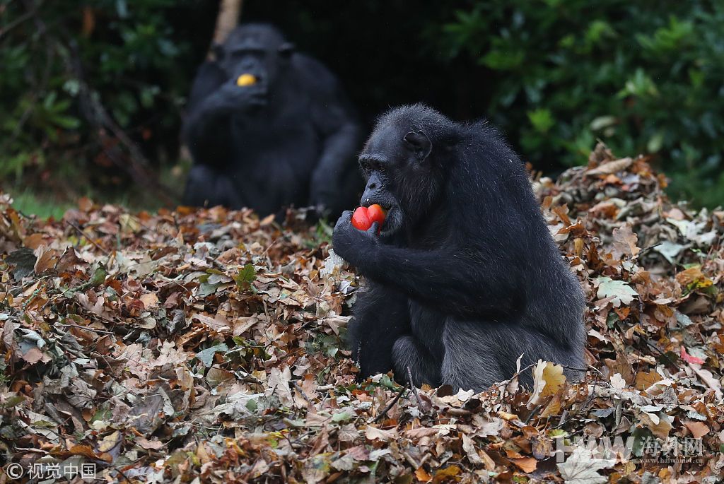 ​2018年10月8日讯,英国布莱尔德拉蒙德,当地野生动物园里的黑猩猩在落叶中寻找工作人员埋藏的食物。