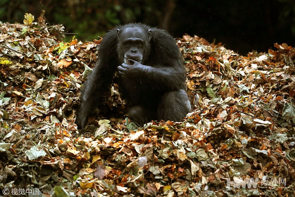 英国野生动物园秋意浓 黑猩猩落叶堆里翻找食物