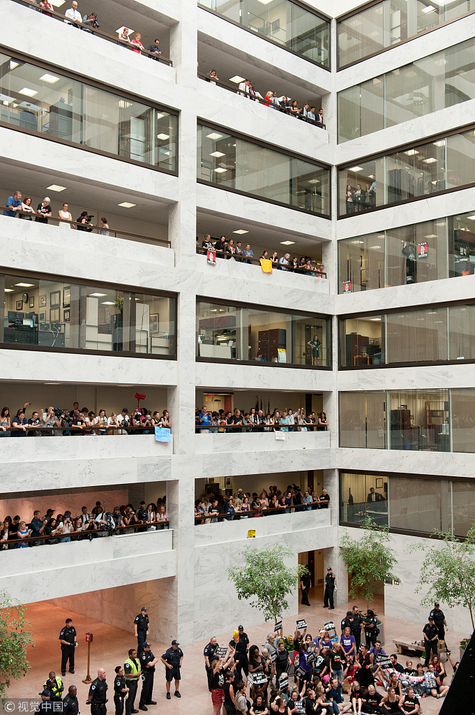 10月4日,示威者闯入美国参议院哈特办公大楼抗议美最高法院大法官提名人卡瓦诺。美国国会警察局表示,他们已经在参议院大楼内逮捕了超过300名“非法示威”的抗议民众。(图片来源:视觉中国)