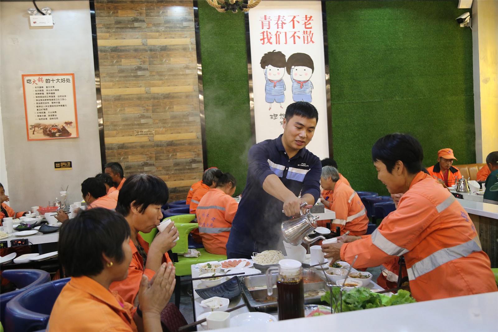 当问到宴请环卫工吃火锅的原因,这家火锅店负责人李隆大说,年初下雪的时候,他经过清河路,看到几名环卫工人在天桥下面冒着风雪吃饭。当时就想,他们太辛苦了,有机会一定请他们吃顿饭。图为火锅店负责人李隆大在给环卫工们倒水。