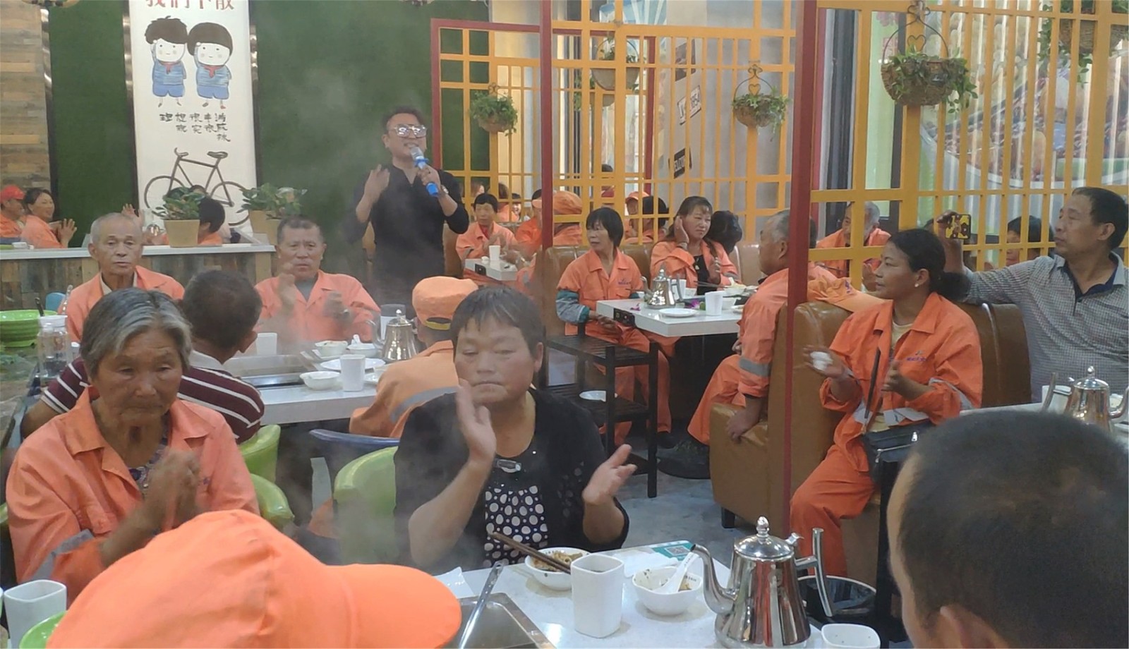 火锅店工作人员为环卫工现场献歌,以感谢环卫工人们平日辛苦付出。
