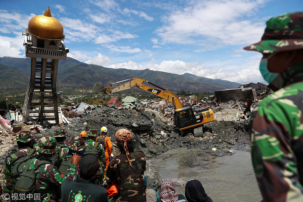当地时间2018年10月8日,印尼帕卢,救援人员持续搜救。印度尼西亚官员7日表示,中苏拉威西省强震和海啸造成的失踪人数据信攀升至多达5000人,这显示灾害造成的遇难人数实际上要比官方发布的1763人多很多。