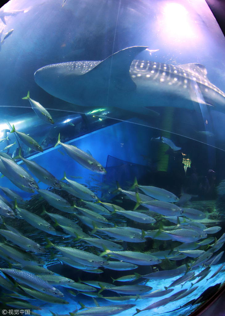 当地时间2018年10月8日,日本横滨,八景岛海岛乐园水族馆从10月4日起开始展出鲸鲨等馆内最大的鱼类,这些鱼类是去年在千叶市海域捕获的。
