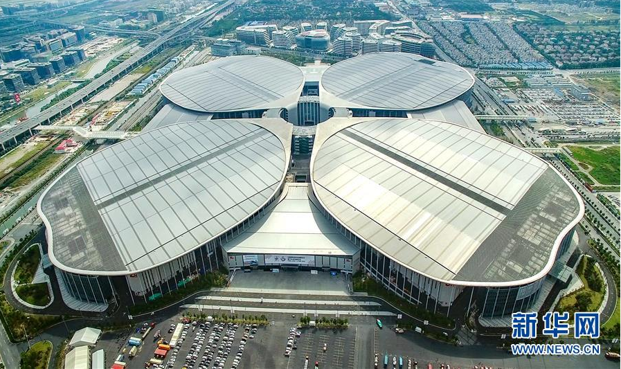 鸟瞰上海国家会展中心(资料照片)。作为全球首个以进口为主题的国家级博览会,即将在100天后举行的首届中国国际进口博览会牵动着所有人的心。这次盛会的举办地上海,已经迈入进口博览会筹备最后“冲刺期”。新华社发(国家会展中心供图)