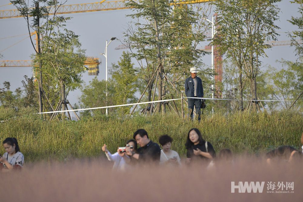 10月9日,河南郑州一片海豚形状的粉黛乱子草盛放,公园变粉色海洋。然而有不少游客无视栏杆,踩入草丛中拍照。为此,一位68岁的保安大爷每天在此值守12小时,连饭都顾不上吃,时不时用高音喇叭劝阻游客,每天喊“出去”超千次。(来源:视觉中国)
