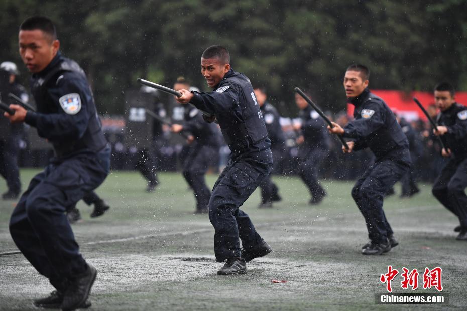 10月12日,新生展示警用防暴棍战术队形。当日,云南警官学院举行2018级新生军训汇报演练,一千余名2018级本科生、研究生依次展示军训成果气势十足。中新社记者  刘冉阳 摄