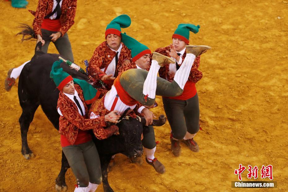 葡萄牙斗牛表演惊险刺激 演员被牛扑倒在地