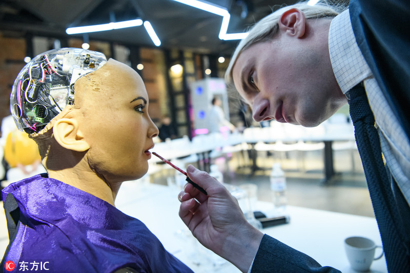 机器人“索菲亚”出访乌克兰 遭乌总理摸脸
