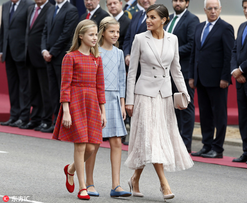 当地时间2018年10月12日,西班牙马德里,西班牙举行国庆日大阅兵仪式。国王费利佩六世偕王后莱蒂齐亚以及小公主莱昂诺尔和索非亚出席。