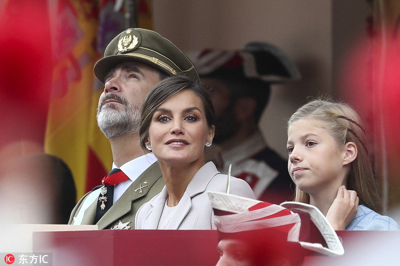 当地时间2018年10月12日,西班牙马德里,西班牙举行国庆日大阅兵仪式。国王费利佩六世偕王后莱蒂齐亚以及小公主莱昂诺尔和索非亚出席。