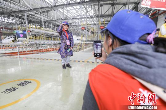 少年儿童在即将担当联调联试检测任务的CRH2C型动车组前合影。 吴正琪 摄